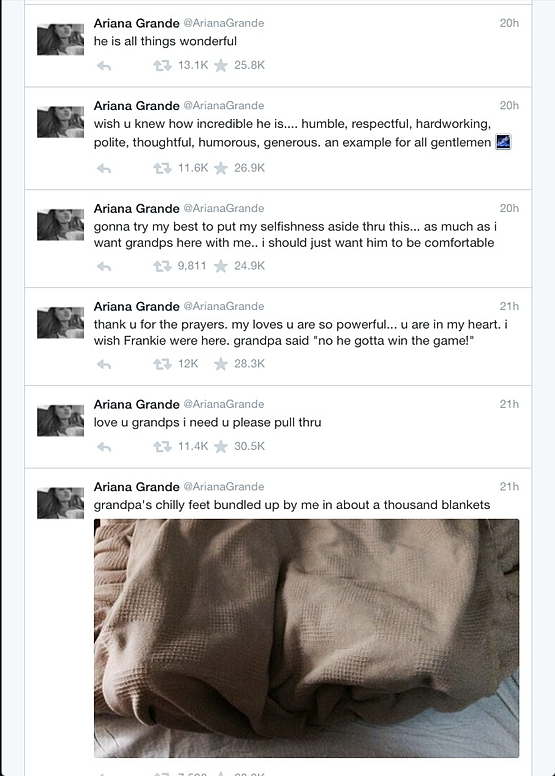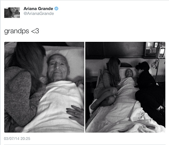 Ariana Grande tweeted about her lovely grandfather yesterday, and they were not so happy tweets. Sadly, Ariana's grandfather is not doing very well and we could noticed how concerned and sad is the singer, thanks to all her emotional tweets and pics. Earlier this year, 90-year-old Grandpa Grande was diagnosed with malignant cancer, but Ariana announced last month that he had finished treatment and successfully beaten the disease. But yesterday, we all found out Ariana's grandpa wasn't quite well due to his pic at the hospital with Ariana and her mom. Of course, fans took to Twitter to show their support to the Grande family and trended #PrayForGrandpaGrande. We hope he recovers soon and that cancer is really away. We know how much Ariana loves and looks up to his grandpa, so, we are with you, Ariana!